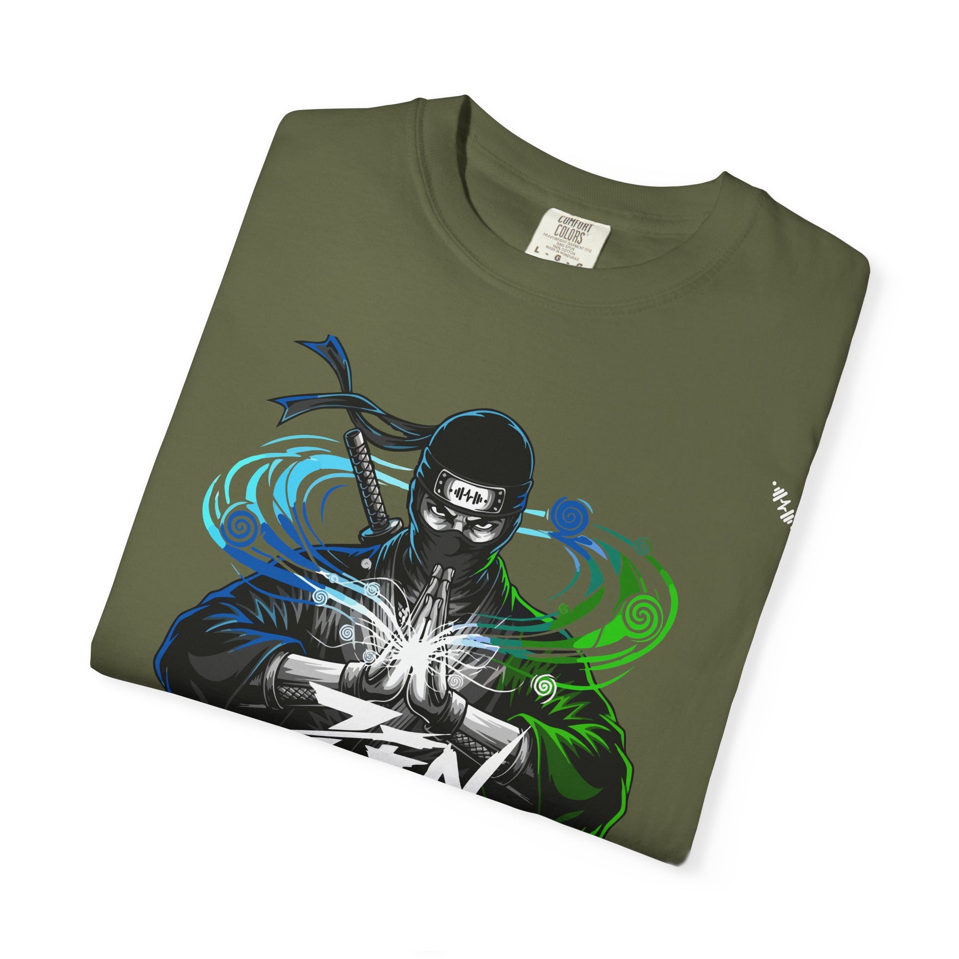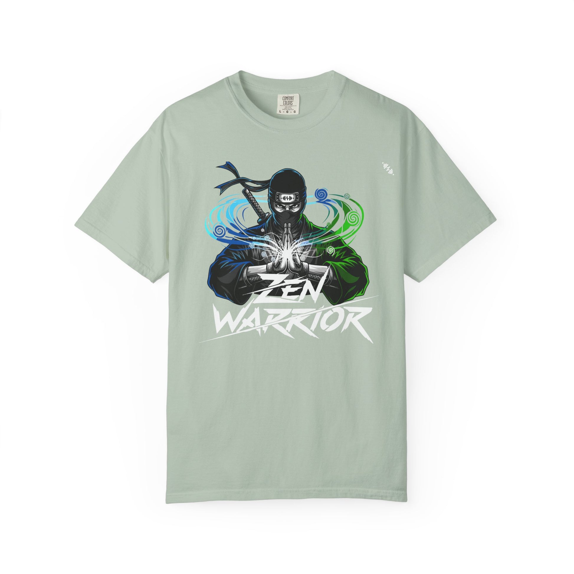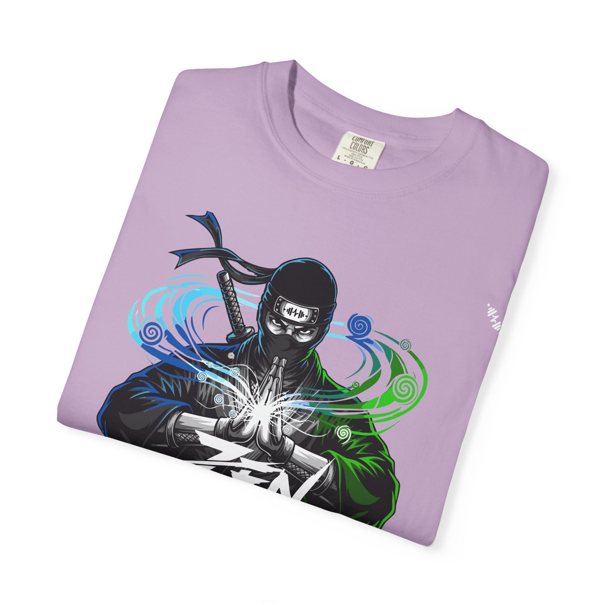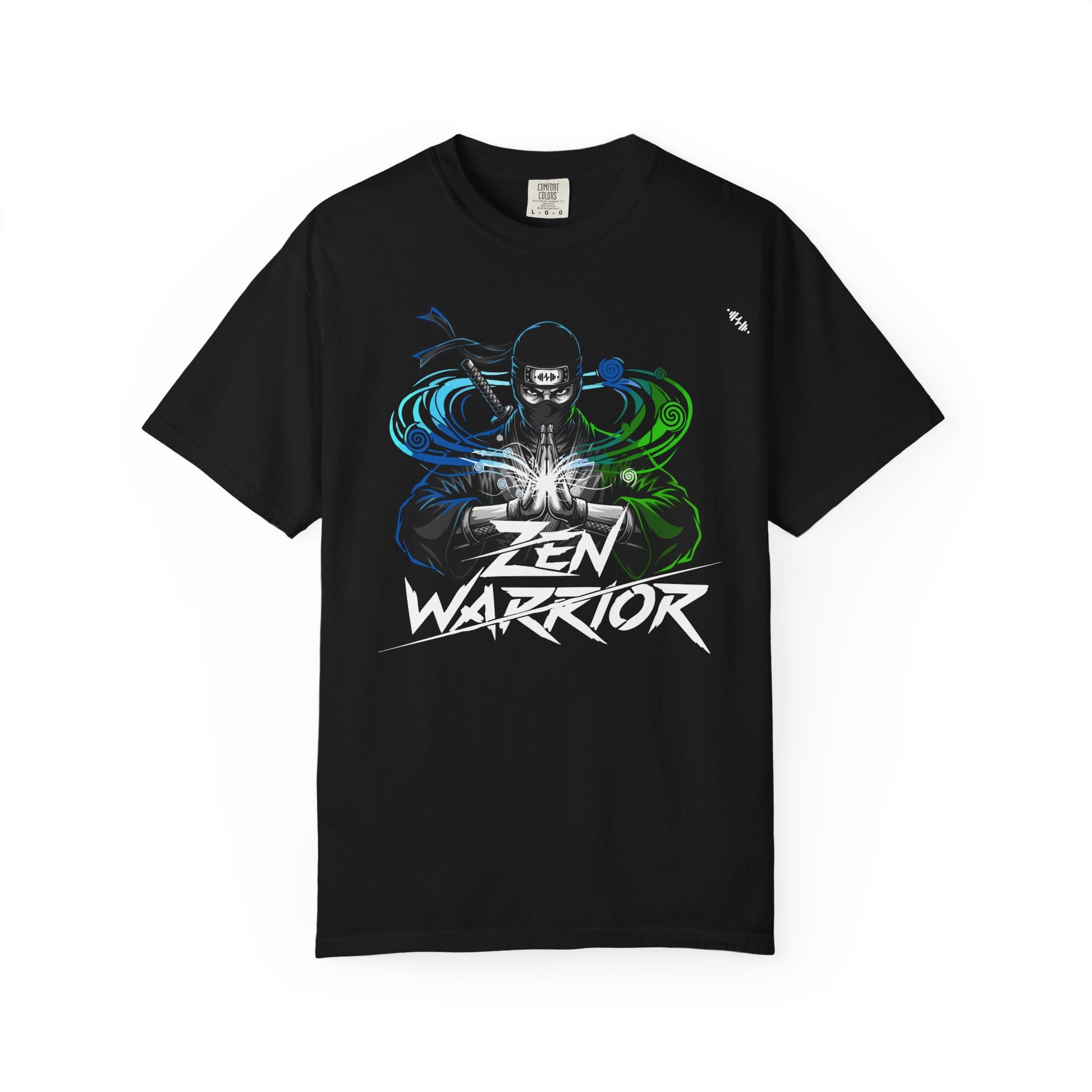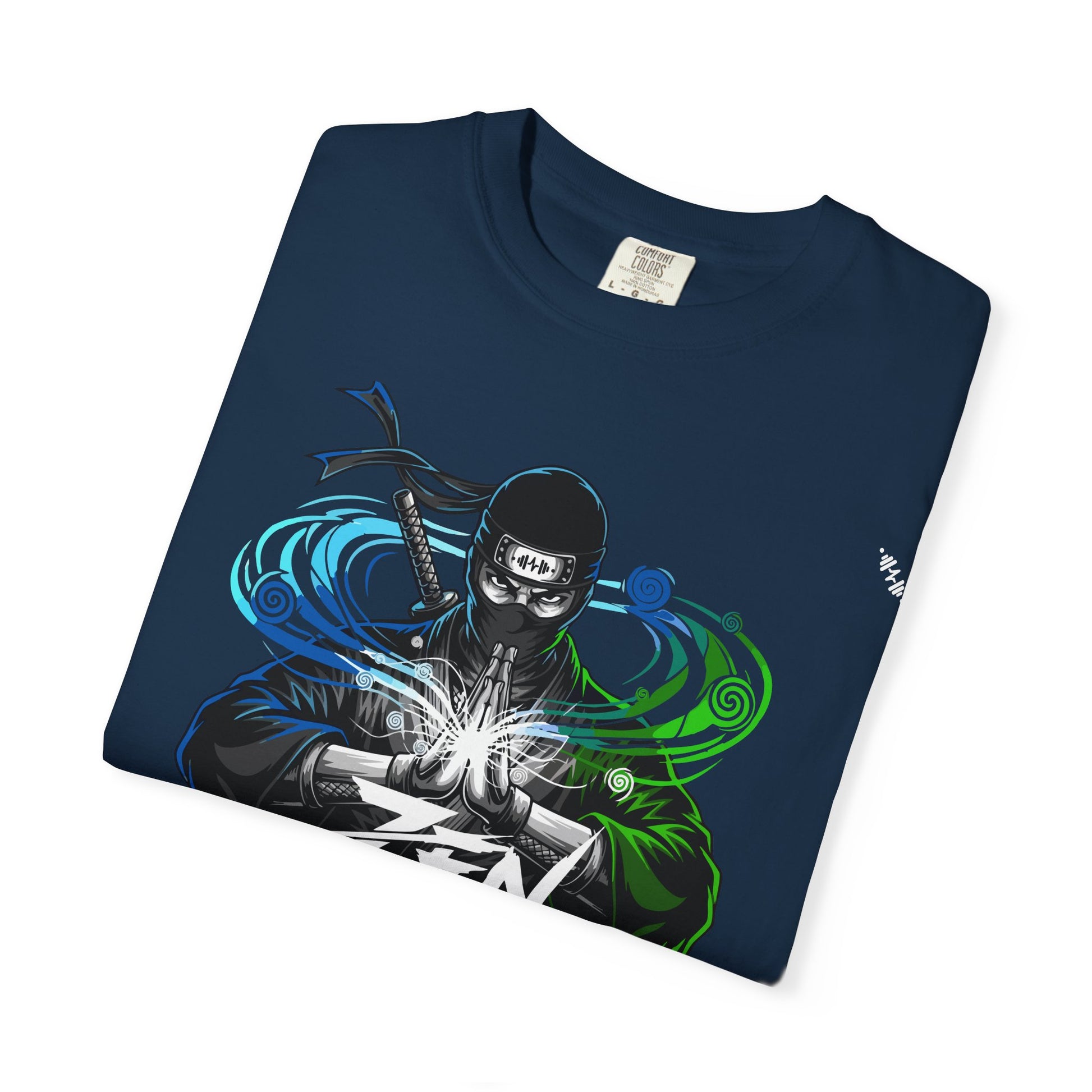 Bold, focused, and powerful. This tee features a striking graphic of a ninja in a meditative stance, surrounded by dynamic energy. The design embodies the spirit of a "Zen Warrior." A Training Tonic QR code is on the back.