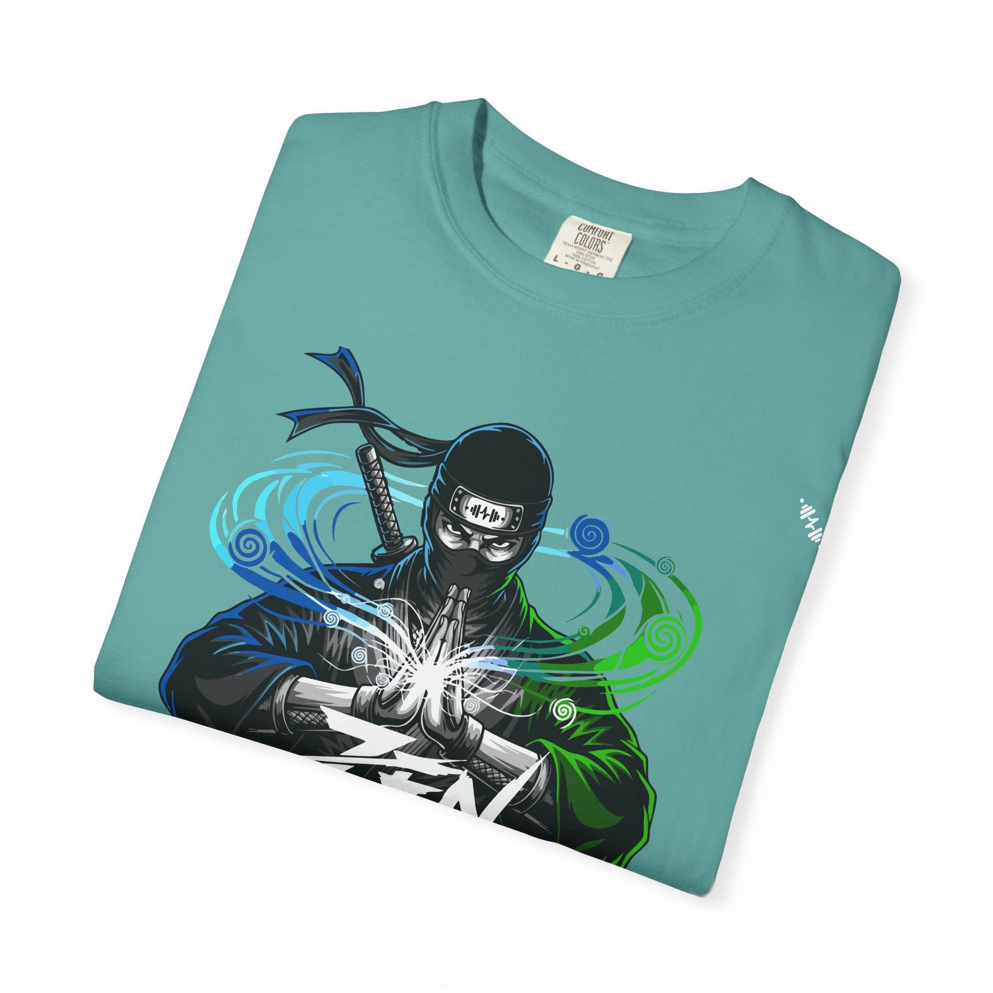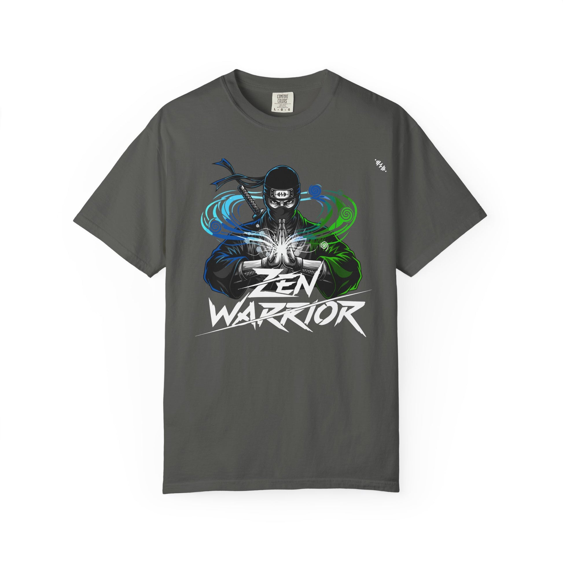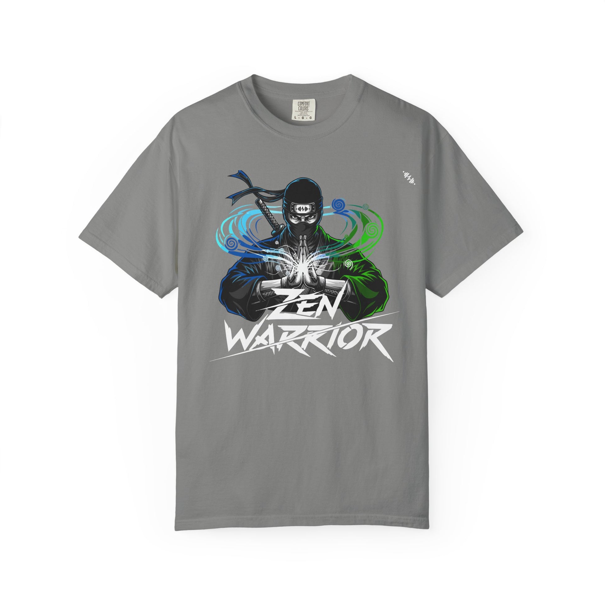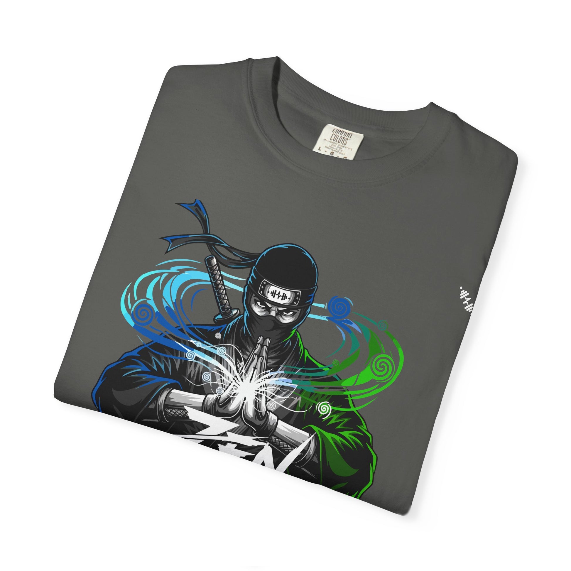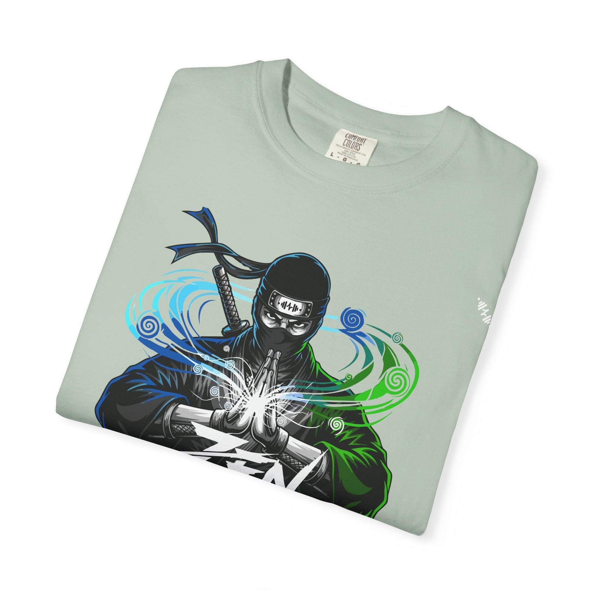 Bold, focused, and powerful. This tee features a striking graphic of a ninja in a meditative stance, surrounded by dynamic energy. The design embodies the spirit of a "Zen Warrior." A Training Tonic QR code is on the back.